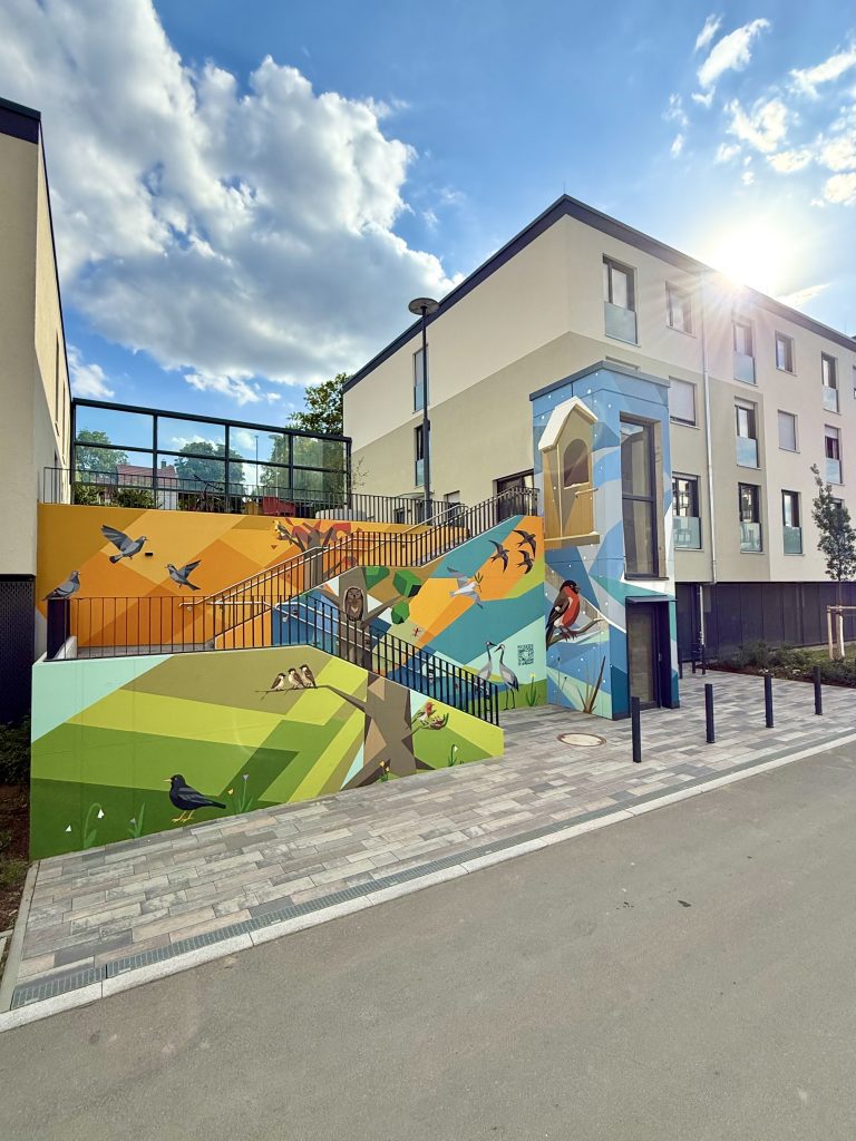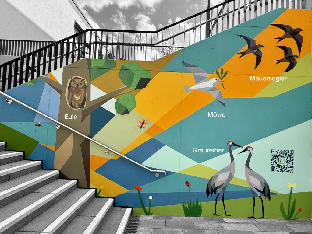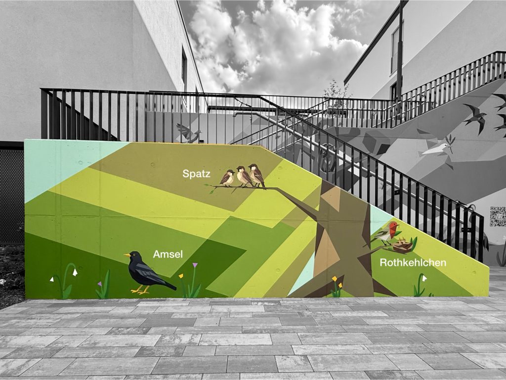 Gemeinsam mit der GNIBMOB GmbH, insbesondere dem Künstler Max Kosta, entwickelten wir das Konzept weiter, visualisierten die Idee detailreich und setzten sie anschließend professionell um. So entstand ein vierteiliges Wandbild, das Frühling, Sommer, Herbst und Winter zeigt – jeweils mit typischen Vögeln, Pflanzen und Insekten, die sich tatsächlich im Umfeld beobachten lassen.