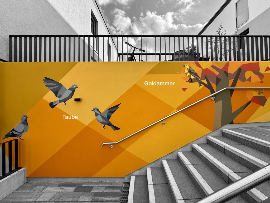 Im Rahmen eines von uns ausgerufenen Wettbewerbs luden wir unsere Bewohner ein, Vorschläge für die künstlerische Gestaltung der Treppenanlage einzureichen. Der Entwurf des jungen Vogelfans Elias und seiner Mutter Silvi überzeugte die Jury. Ihr Konzept, die heimischen Vogelarten nach Jahreszeiten geordnet auf den Wandflächen darzustellen, begeisterte durch Wissen, Standortbezug und kreative Klarheit.